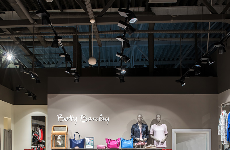Наша компанія втілила у життя проєкт освітлення для магазину Betty Barclay. Це відомий німецький бренд, що випускає жіночий одяг, взуття, аксесуари та парфумерію. Замовник вважав за краще висвітлити приміщення лише трековими прожекторами, у такий спосіб вдалося створити драматичну атмосферу освітлення в магазині та підкреслити свій асортимент із кращого боку. Завдяки великій кількості джерел світла магазин виглядає яскраво і виділяється на тлі інших торгових приміщень. Висвітлювати магазин трековими прожекторами – дуже практичне рішення, тому що при перестановці торгового обладнання ви зможете керувати джерелами світла і спрямовувати їх в потрібну сторону. Освітлення, реалізоване на точкових врізних світильниках, з функціональної точки зору, не є настільки ефективним для подібних об’єктів.
