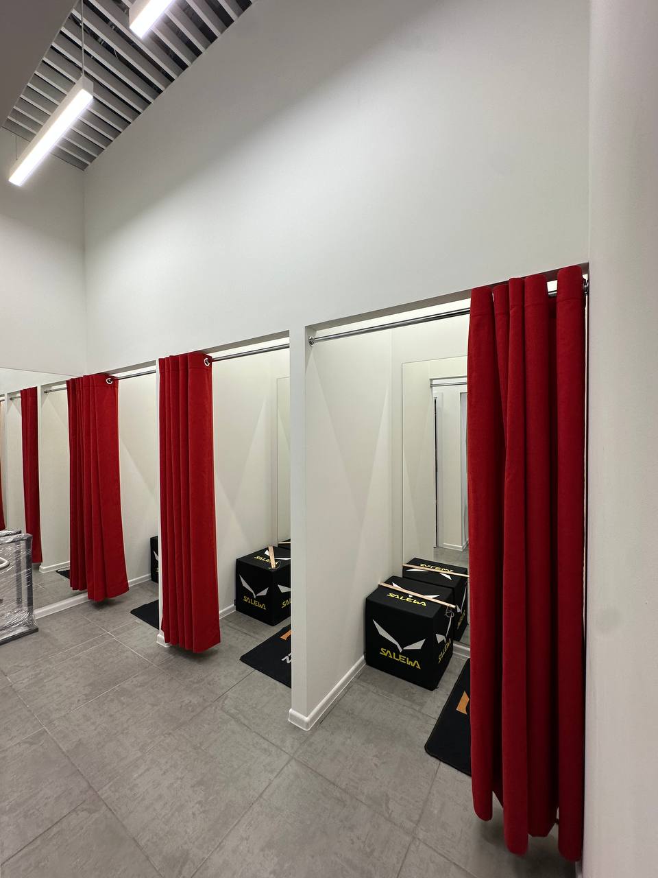 У примірочних встановлено рівномірне світло без тіней, з приємною світловою температурою. Це важливо для туристичного одягу, де важливо бачити точний колір і зручність посадки.